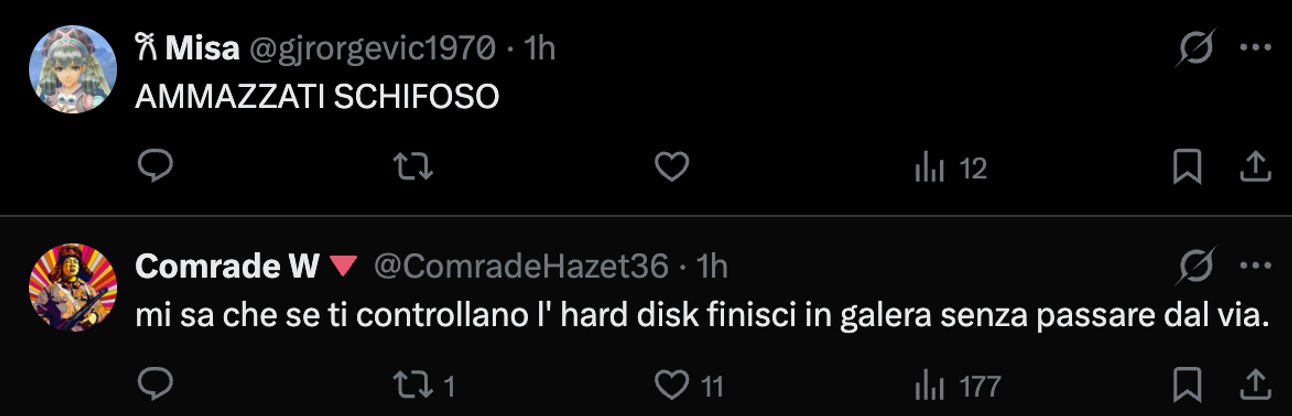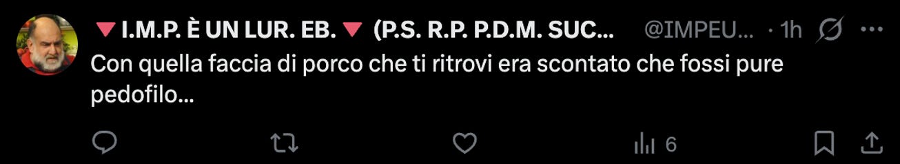 Non si contano poi gli inviti al suicidio e l’istigazione a delinquere rivolta a chi, incontrandomi per strada, dovrebbe fare giustizia ammazzandomi o massacrandomi di botte.